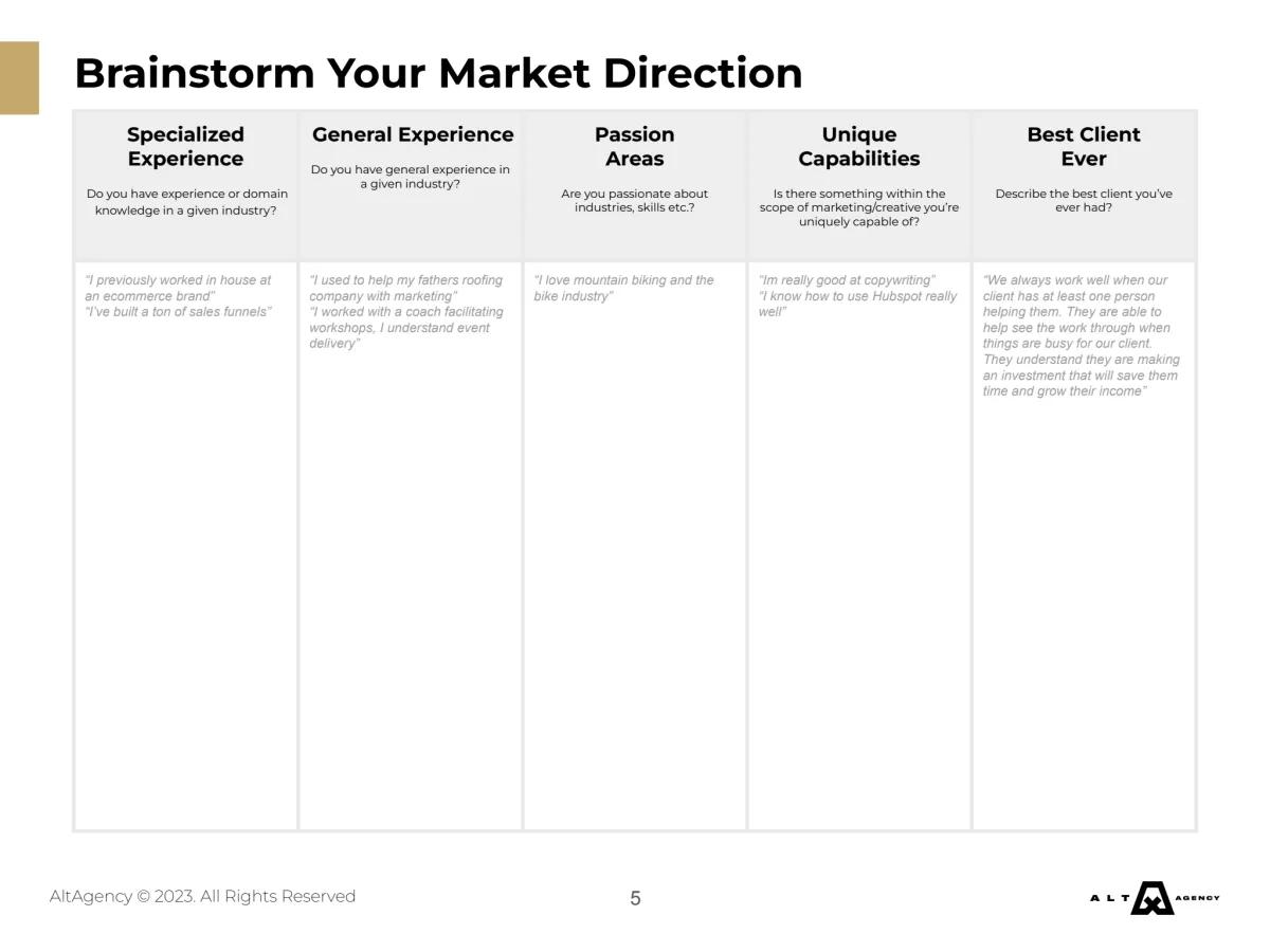 Find your “sweet spot” at the overlap of specialized experience, unique capabilities, passion, and your best past clients. Learn the modern WHO/WHAT matrix and how to pick a sub-market so you gain momentum quickly. Includes the Brainstorm Your Market Direction worksheet.